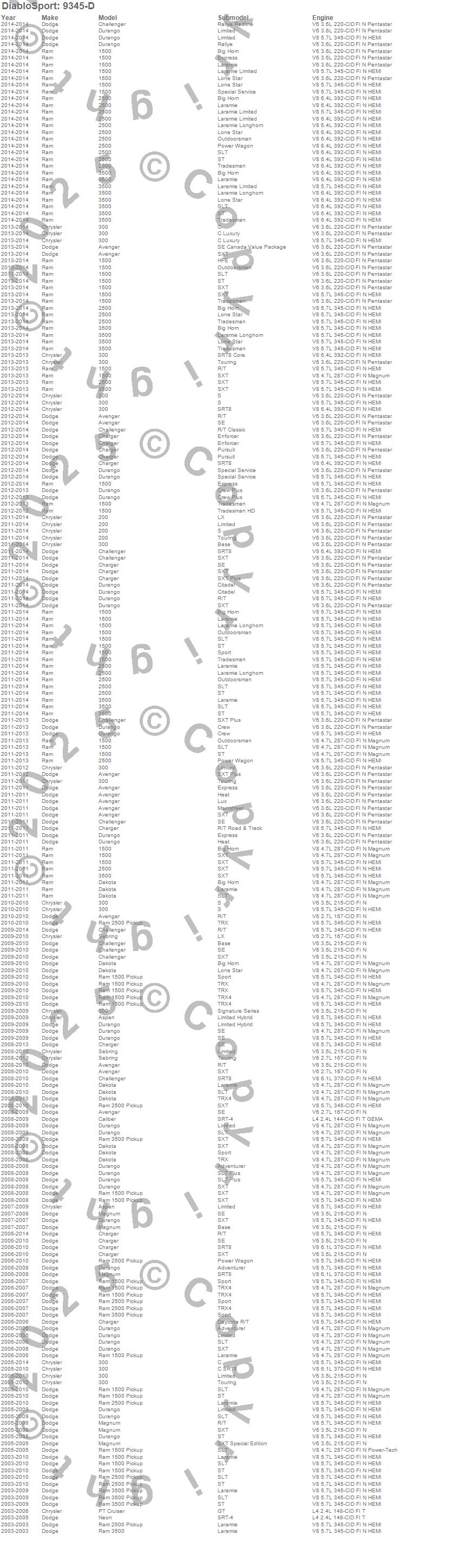 1500, 200, 2500, 300, 3500, Aspen, Avenger, Caliber, Challenger, Charger, Dakota, Durango, Magnum, Neon, PT Cruiser, Ram 1500, Ram 2500, Ram 3500, Sebring, Chrysler