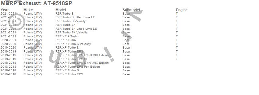 RZR Turbo S, RZR Turbo S Lifted Lime LE, RZR Turbo S Velocity, RZR Turbo S4, RZR Turbo S4 Lifted Lime LE, RZR Turbo S4 Velocity, RZR XP 4 Turbo, RZR XP Turbo, RZR XP Turbo EPS, RZR XP Turbo EPS DYNAMIX Edition, RZR XP Turbo EPS Fox Edition, RZR XP Turbo EPS LE, RZR XP Turbo S, RZR XP Turbo S Velocity, Polaris (UTV), 2021, 2020, 2019, 2018, 2017