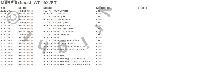 RZR RS1, RZR XP 1000, RZR XP 1000 EPS, RZR XP 1000 EPS DYNAMIX Edition, RZR XP 1000 EPS High Lifter Edition, RZR XP 1000 EPS Ride Command Edition, RZR XP 1000 EPS Trails and Rock Edition, RZR XP 1000 High Lifter, RZR XP 1000 High Lifter Edition, RZR XP 1000 Limited Edition, RZR XP 1000 Premium, RZR XP 1000 Sport, RZR XP 1000 Trails & Rocks, RZR XP 1000 Trails and Rock Edition, RZR XP 1000 Ultimate, RZR XP 4 1000 High Lifter, RZR XP 4 1000 Premium, RZR XP 4 1000 Sport, RZR XP 4 1000 Ultimate, Polaris (UTV)