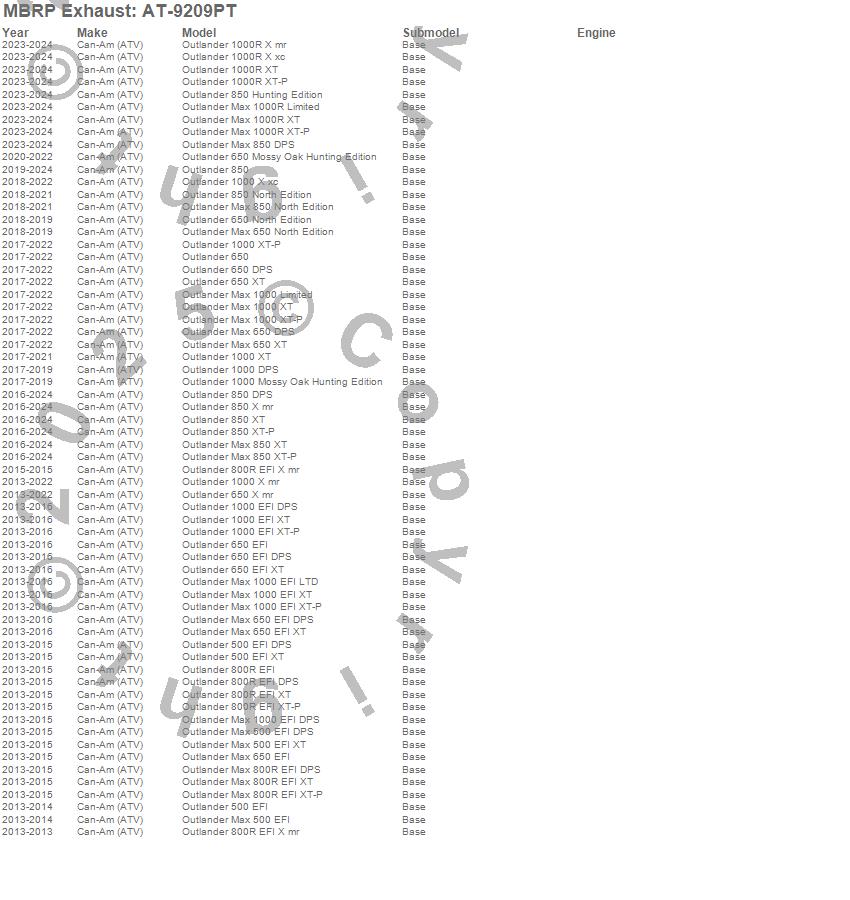 Outlander 1000 DPS, Outlander 1000 EFI DPS, Outlander 1000 EFI XT, Outlander 1000 EFI XT-P, Outlander 1000 Mossy Oak Hunting Edition, Outlander 1000 X mr, Outlander 1000 X xc, Outlander 1000 XT, Outlander 1000 XT-P, Outlander 1000R X mr, Outlander 1000R X xc, Outlander 1000R XT, Outlander 1000R XT-P, Outlander 500 EFI, Outlander 500 EFI DPS, Outlander 500 EFI XT, Outlander 650, Outlander 650 DPS, Outlander 650 EFI, Outlander 650 EFI DPS