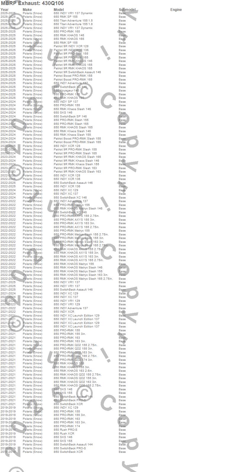 650 INDY Adventure 137, 650 INDY VR1 129, 650 INDY VR1 137, 650 INDY VR1 137 Dynamix, 650 INDY XC 129, 650 INDY XC 137, 650 INDY XC Launch Edition 129, 650 INDY XC Launch Edition 137, 650 INDY XCR 128, 650 INDY XCR 129, 650 INDY XCR 136, 650 INDY XCR 137, 650 PRO-RMK Matryx 155, 650 RMK Khaos Slash 146, 650 SwitchBack Assault 146, 650 SwitchBack XC 146, 850 INDY Adventure 137, 850 INDY VR1 129, 850 INDY VR1 137, 850 INDY VR1 137 Dynamix