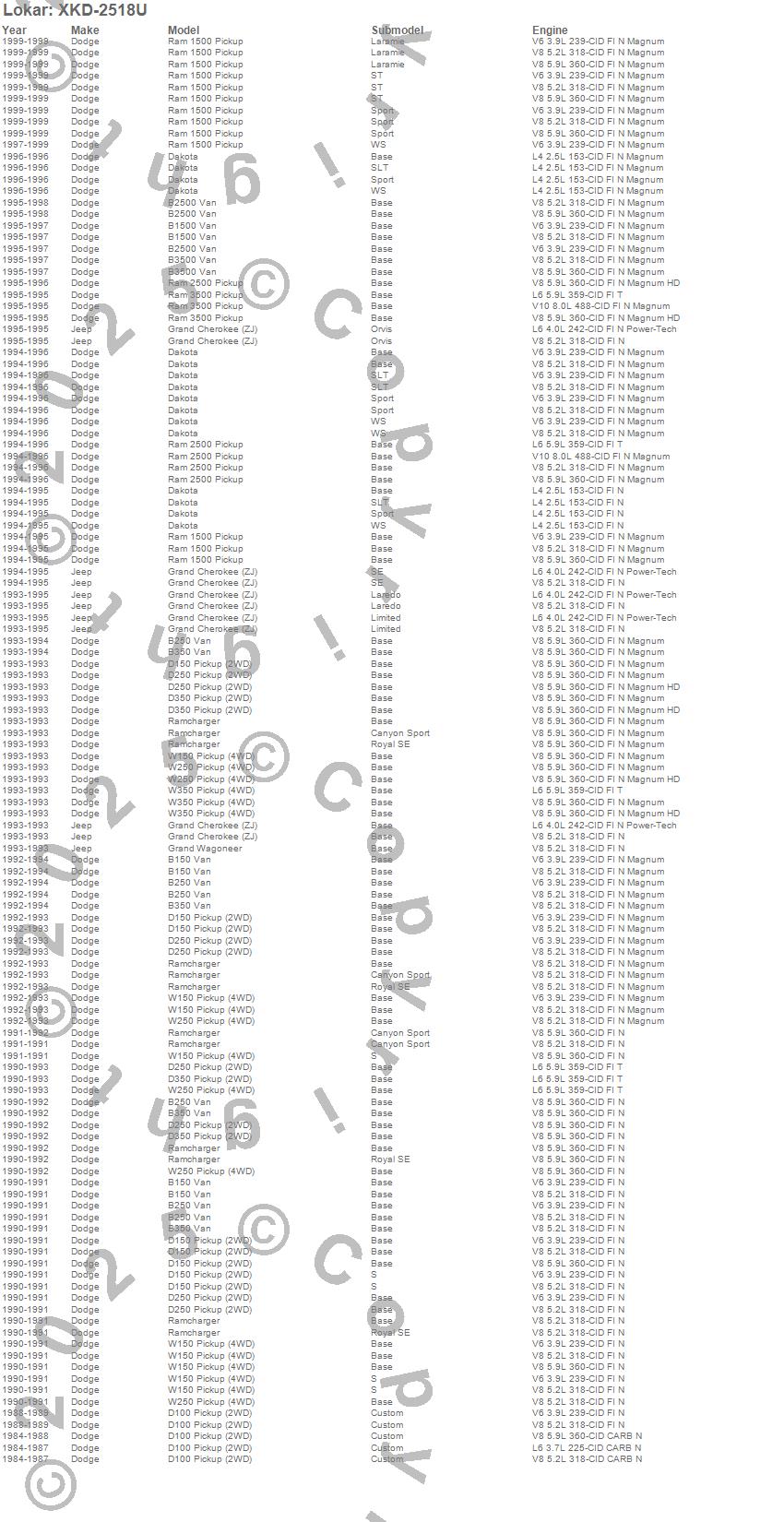 B150 Van, B1500 Van, B250 Van, B2500 Van, B350 Van, B3500 Van, D100 Pickup, D150 Pickup, D250 Pickup, D350 Pickup, Dakota, Grand Cherokee (ZJ), Grand Wagoneer, Ram 1500, Ram 2500, Ram 3500, Ramcharger, W150 Pickup, W250 Pickup, W350 Pickup