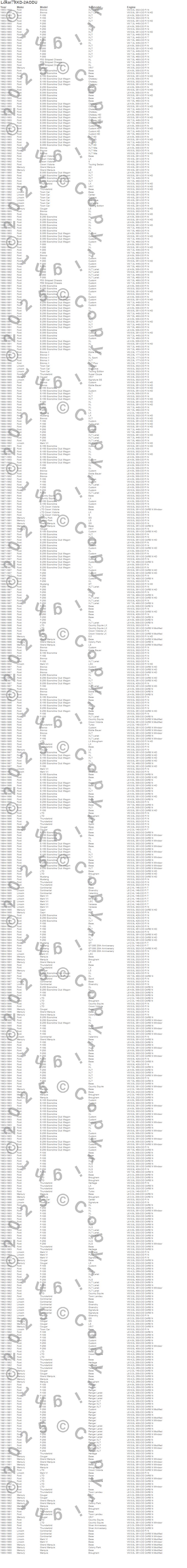 Bronco, Bronco II, Capri, Colony Park, Continental, Cougar, Country Squire, Crown Victoria, E-100 Econoline, E-100 Econoline Club Wagon, E-150 Econoline, E-150 Econoline Club Wagon, E-250 Econoline, E-250 Econoline Club Wagon, E-350 Econoline, E-350 Econoline Club Wagon, F-100, F-150, F-250, F-350