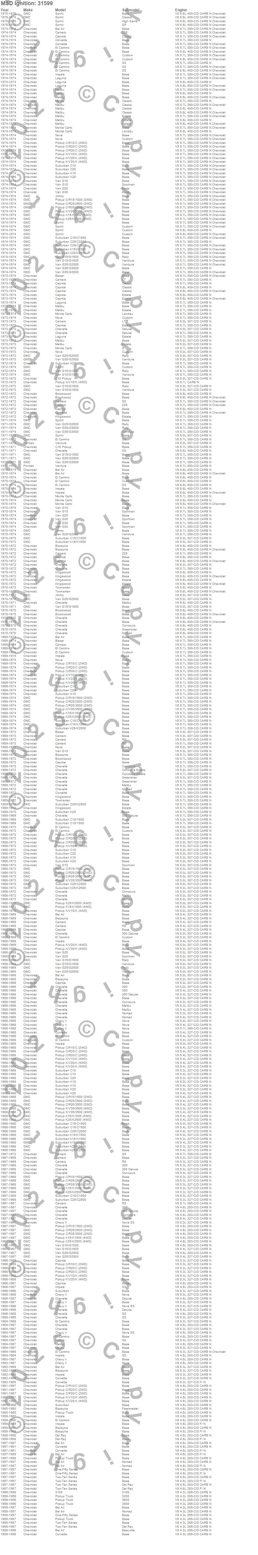 3100, Bel Air, Biscayne, Blazer, Brookwood, C10 Pickup, C10 Suburban, C15/C1500 Suburban, C1500 Pickup, C20 Pickup, C20 Suburban, C25/C2500 Pickup, C25/C2500 Suburban, C30 Pickup, C35/C3500 Pickup, Camaro, Caprice, Chevelle, Chevy II, Corvette