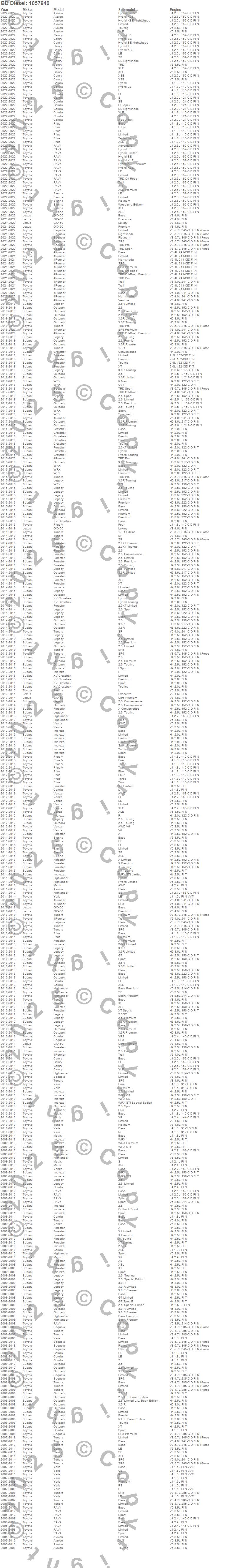 4Runner, Avalon, Camry, Corolla, Crosstrek, Forester, GX460, Highlander, Impreza, Legacy, Matrix, Outback, Prius, Prius V, RAV4, Sequoia, Sienna, Tundra, Venza, WRX