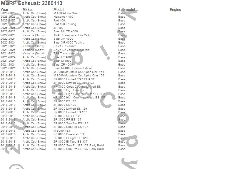 Below is an abbreviated list of applications for the Snowmobile Race Exhaust.