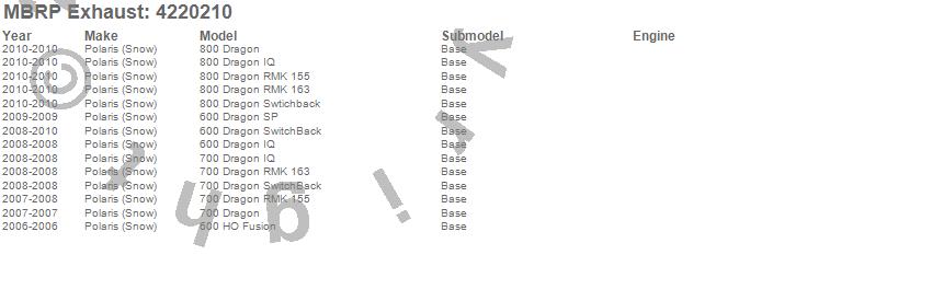 600 Dragon IQ, 600 Dragon SP, 600 Dragon SwitchBack, 600 HO Fusion, 700 Dragon, 700 Dragon IQ, 700 Dragon RMK 155, 700 Dragon RMK 163, 700 Dragon SwitchBack, 800 Dragon, 800 Dragon IQ, 800 Dragon RMK 155, 800 Dragon RMK 163, 800 Dragon Swtichback, Polaris (Snow), 2010, 2009, 2008, 2007, 2006
