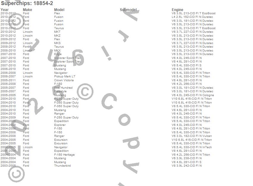 Crown Victoria, Edge, Excursion, Expedition, Explorer, Explorer Sport Trac, F-150, F-150 Heritage, F-250 Super Duty, F-350 Super Duty, Five Hundred, Flex, Freestyle, Fusion, Mark LT, MKS, MKT, MKX, MKZ, Mustang