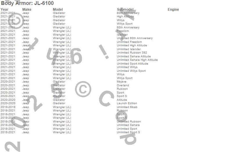 Body Armor - Fender Liners P/N JL-6100 Features: