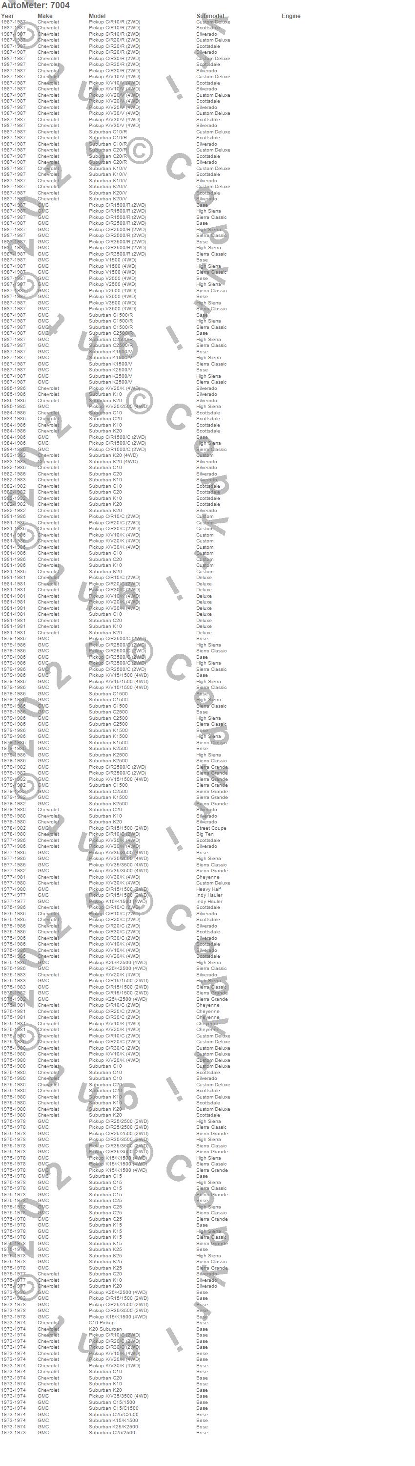 C10 Pickup, C10 Suburban, C15 Suburban, C15/C1500 Suburban, C1500 Pickup, C1500 Suburban, C20 Pickup, C20 Suburban, C25 Suburban, C25/C2500 Pickup, C25/C2500 Suburban, C2500 Pickup, C2500 Suburban, C30 Pickup, C35/C3500 Pickup, C3500 Pickup, K10 Pickup, K10 Suburban, K15 Suburban, K15/K1500 Pickup