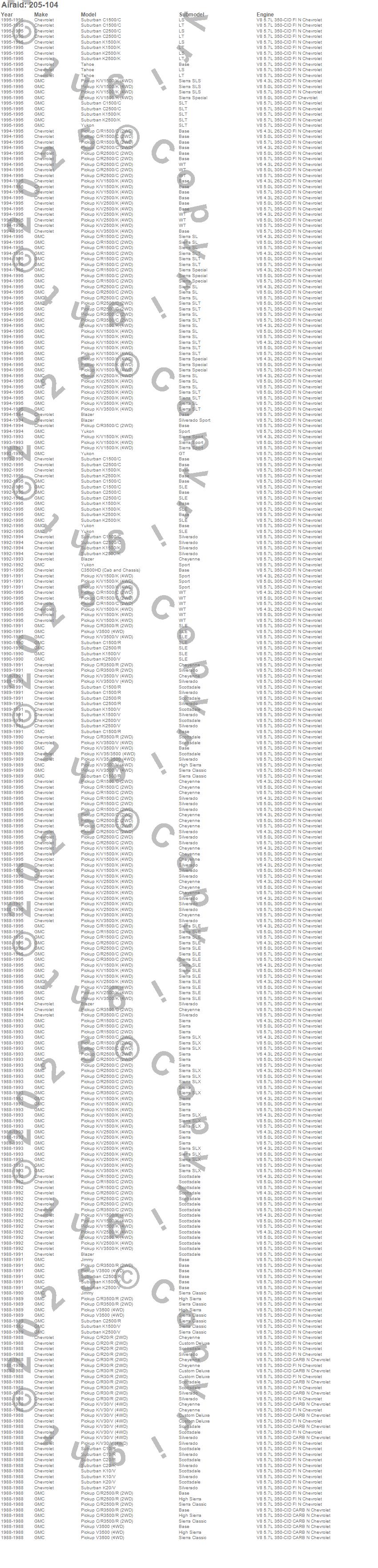 Blazer, C1500 Pickup, C1500 Suburban, C2500 Pickup, C2500 Suburban, C3500 Pickup, C3500HD, Jimmy, K1500, K1500 Pickup, K1500 Suburban, K2500 Pickup, K2500 Suburban, K3500 Pickup, R10 Suburban, R1500 Suburban, R20 Pickup, R20 Suburban, R2500 Pickup, R2500 Suburban