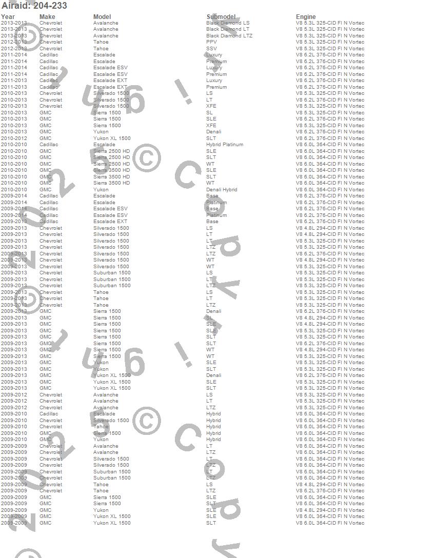 Avalanche, Escalade, Escalade ESV, Escalade EXT, Sierra 1500, Sierra 2500 HD, Sierra 3500 HD, Silverado 1500, Suburban 1500, Tahoe, Yukon, Yukon XL 1500, Cadillac, Chevrolet, GMC, 2014, 2013, 2012, 2011, 2010