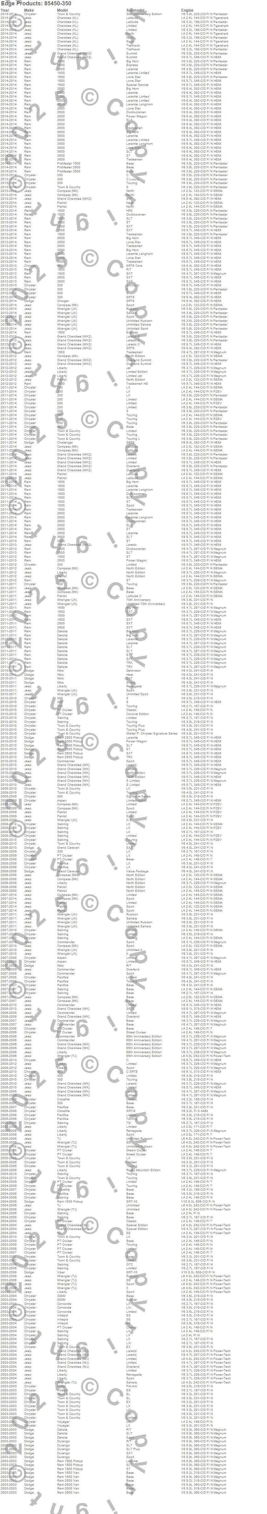 1500, 200, 2500, 300, 300M, 3500, Aspen, Challenger, Charger, Cherokee (KL), Commander, Compass, Concorde, Crossfire, Dakota, Durango, Grand Caravan, Grand Cherokee (WJ), Grand Cherokee (WK), Grand Cherokee (WK2)
