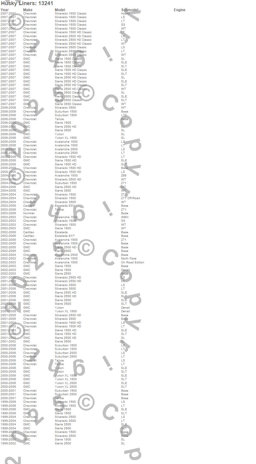 Avalanche 1500, Avalanche 2500, Escalade, Escalade ESV, Escalade EXT, H2, Sierra 1500, Sierra 1500 Classic, Sierra 1500 HD, Sierra 1500 HD Classic, Sierra 2500, Sierra 2500 HD, Sierra 2500 HD Classic, Sierra 3500, Sierra 3500 Classic, Silverado 1500, Silverado 1500 Classic, Silverado 1500 HD, Silverado 1500 HD Classic, Silverado 2500