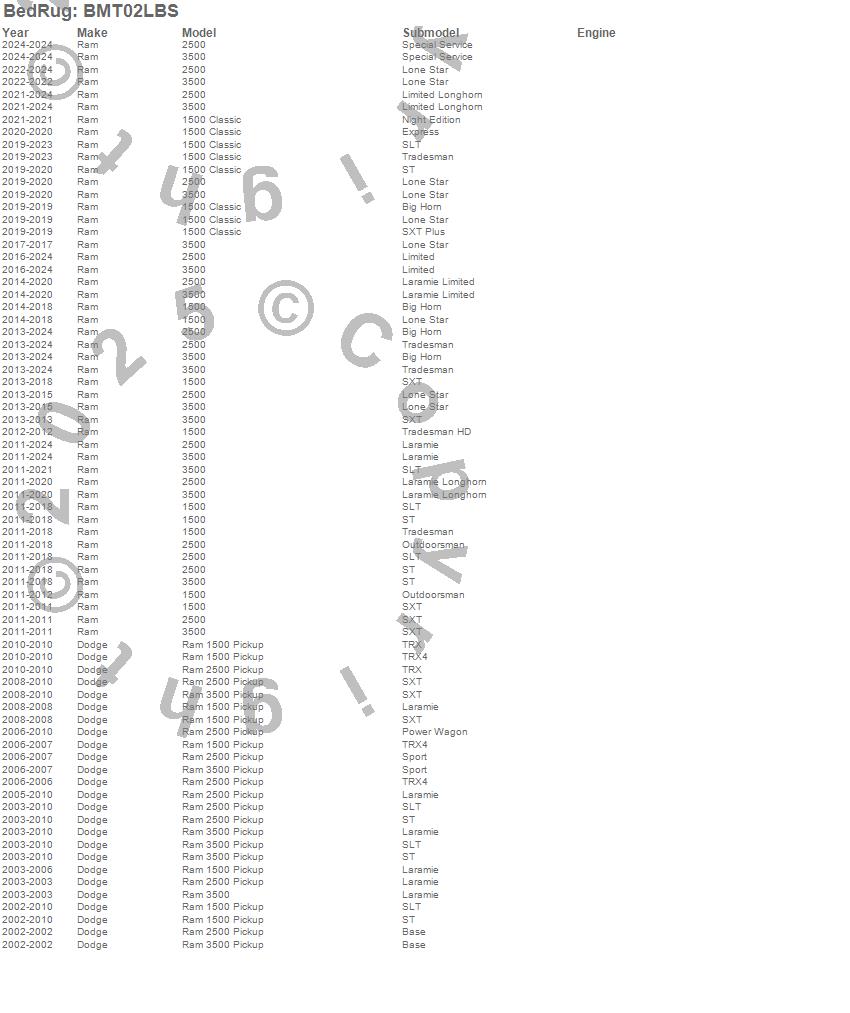 Below is an abbreviated list of applications for the BedRug Floor Truck Bed Mat.