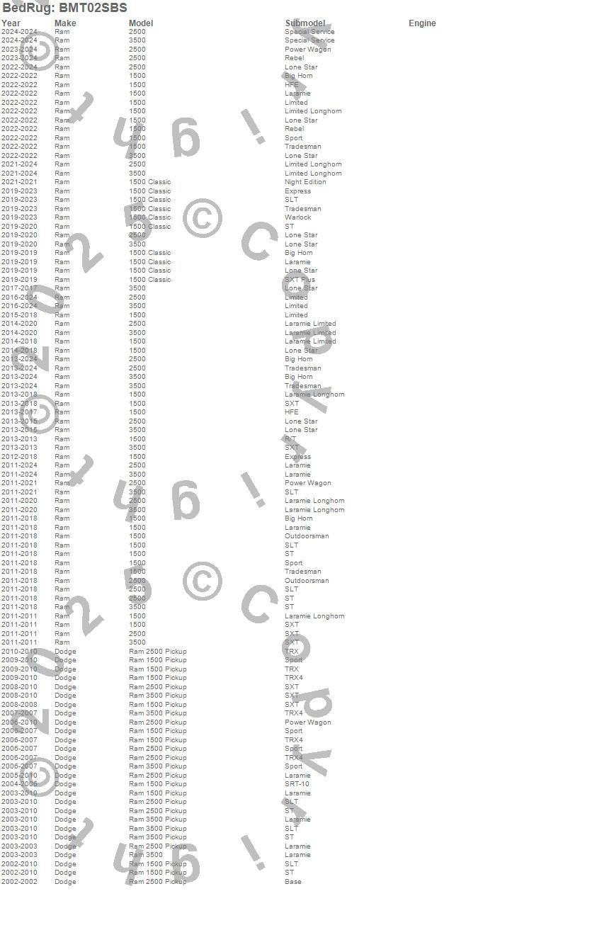 Below is an abbreviated list of applications for the BedRug Floor Truck Bed Mat.