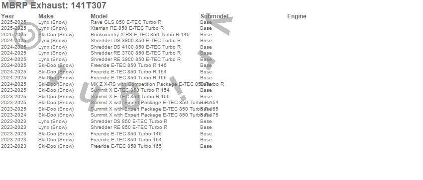 Backcountry X-RS E-TEC 850 Turbo R 146, Freeride E-TEC 850 Turbo 146, Freeride E-TEC 850 Turbo 154, Freeride E-TEC 850 Turbo 165, Freeride E-TEC 850 Turbo R 146, Freeride E-TEC 850 Turbo R 154, Freeride E-TEC 850 Turbo R 165, MX Z X-RS with Competition Package E-TEC 850 Turbo R, Rave GLS 850 E-TEC Turbo R, Rave RE 850 E-TEC Turbo R, Shredder DS 3900 850 E-TEC Turbo R, Shredder DS 4100 850 E-TEC Turbo R, Shredder DS 850 E-TEC Turbo R, Shredder RE 3700 850 E-TEC Turbo R, Shredder RE 3900 850 E-TEC Turbo R, Shredder RE 850 E-TEC Turbo R, Summit Adrenaline with Edge Package E-TEC 850 Turbo R 154, Summit Adrenaline with Edge Package E-TEC 850 Turbo R 165, Summit X E-TEC 850 Turbo R 154, Summit X E-TEC 850 Turbo R 165