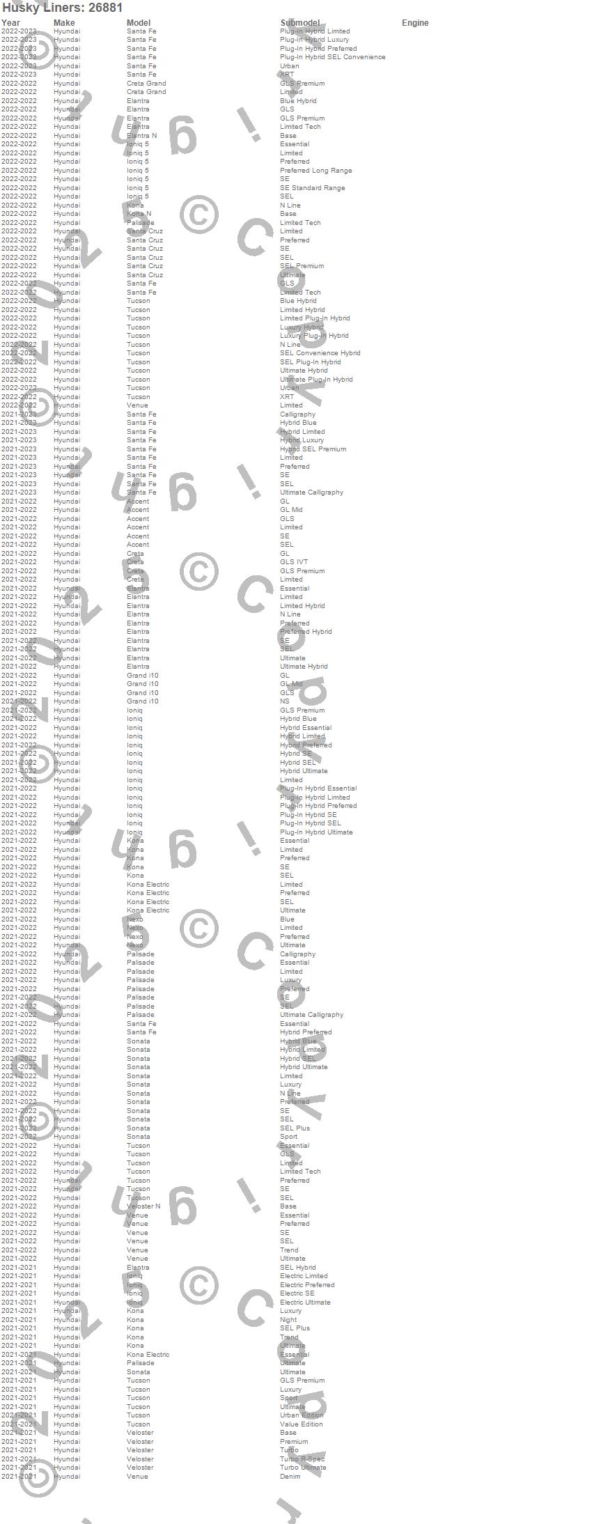 Accent, Creta, Creta Grand, Elantra, Elantra N, Grand i10, Ioniq, Ioniq 5, Kona, Kona Electric, Kona N, Nexo, Palisade, Santa Cruz, Santa Fe, Sonata, Tucson, Veloster, Veloster N, Venue