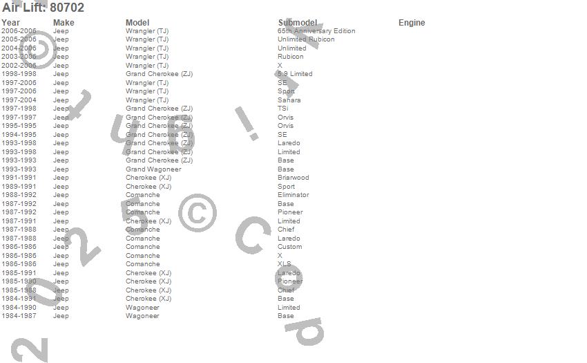 Cherokee (XJ), Comanche, Grand Cherokee (ZJ), Grand Wagoneer, Wagoneer, Wrangler (TJ), Jeep, 2006, 2005, 2004, 2003, 2002, 2001, 2000, 1999, 1998, 1997, 1996, 1995, 1994