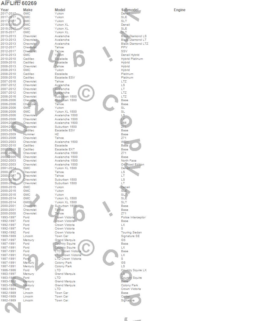 Avalanche, Avalanche 1500, Colony Park, Country Squire, Crown Victoria, Escalade, Escalade ESV, Escalade EXT, Grand Marquis, H2, LTD, LTD Crown Victoria, Suburban 1500, Tahoe, Town Car, Yukon, Yukon XL, Yukon XL 1500, Cadillac, Chevrolet