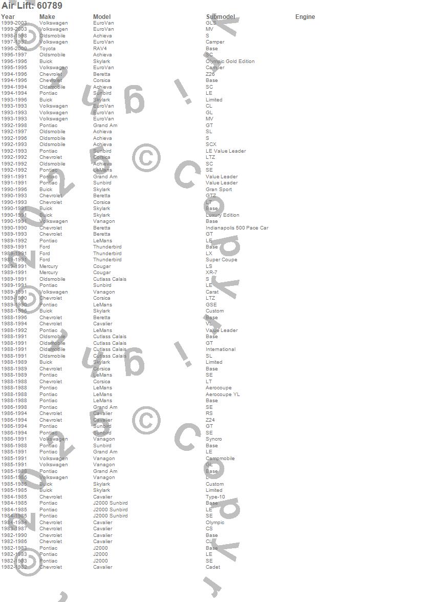 Achieva, Beretta, Cavalier, Corsica, Cougar, Cutlass Calais, EuroVan, Grand Am, J2000, J2000 Sunbird, LeMans, RAV4, Skylark, Sunbird, Thunderbird, Vanagon, Buick, Chevrolet, Ford, Mercury