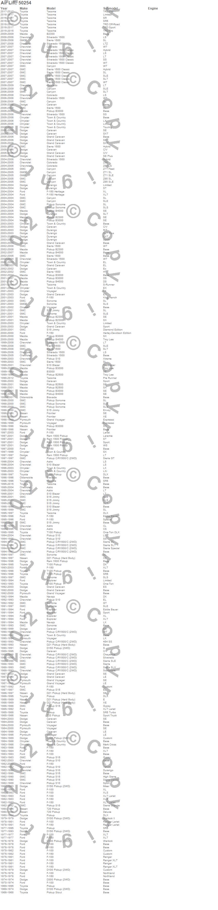 720 Pickup, Astro, B2300, B2500, B3000, B4000, Bravada, C1500 Pickup, Canyon, Caravan, Colorado, D100 Pickup, D150 Pickup, D21 Pickup (Hard Body), D300 Pickup, Durango, Explorer, F-100, F-150, F-150 Heritage