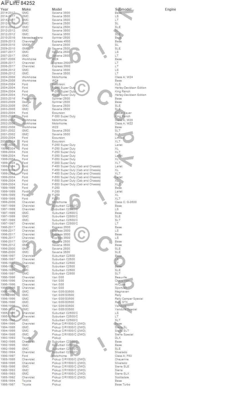 Below is an abbreviated list of applications for the LoadLifter 5000 Ultimate Replacement Air Spring.