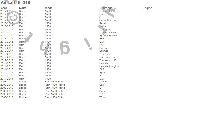 Below is an abbreviated list of applications for the Air Lift 1000 Replacement Bag.
