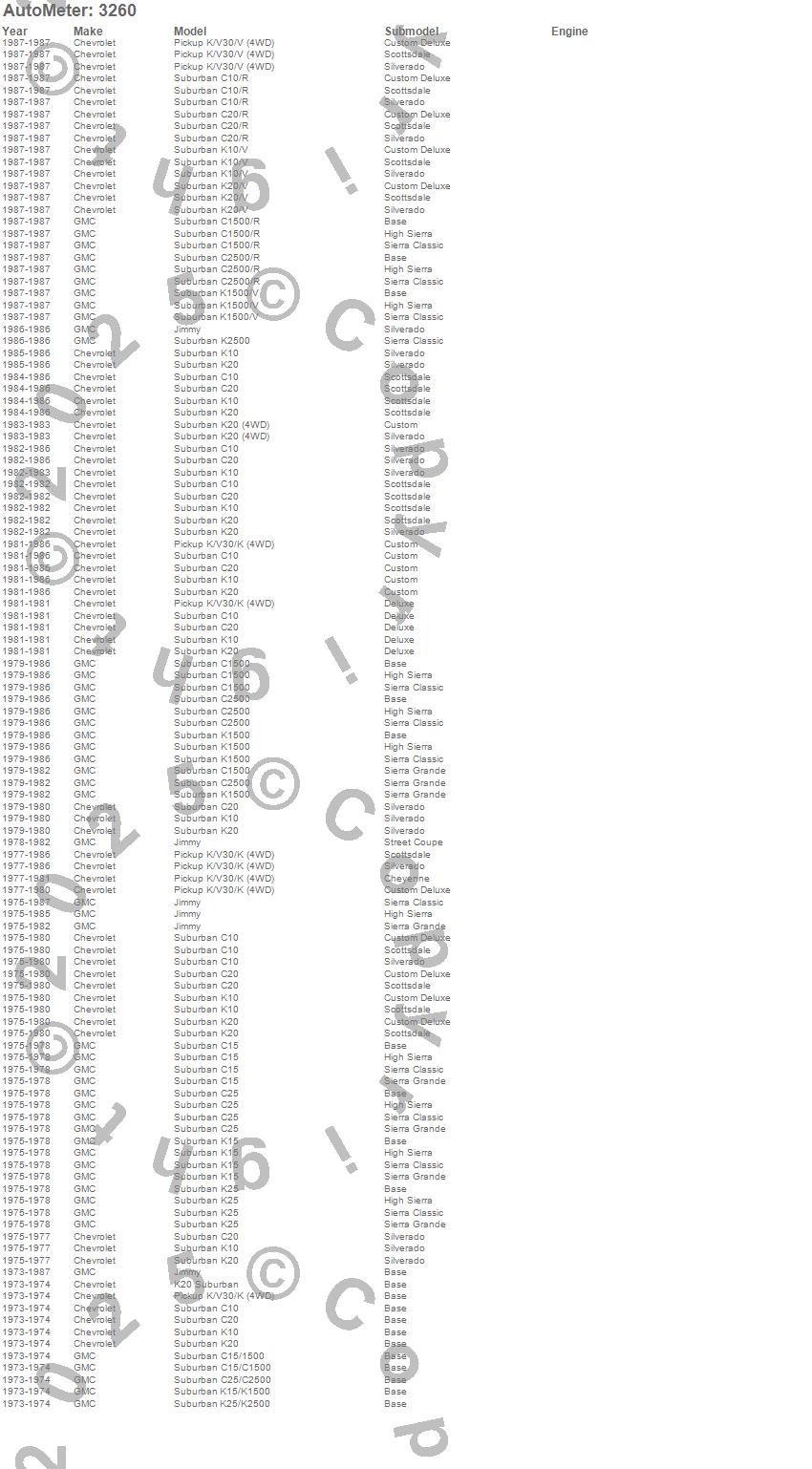 C10 Suburban, C15 Suburban, C15/C1500 Suburban, C1500 Suburban, C20 Suburban, C25 Suburban, C25/C2500 Suburban, C2500 Suburban, Jimmy, K10 Suburban, K15 Suburban, K15/K1500 Suburban, K1500 Suburban, K20 Suburban, K25 Suburban, K25/K2500 Suburban, K2500 Suburban, K30 Pickup, R10 Suburban, R1500 Suburban