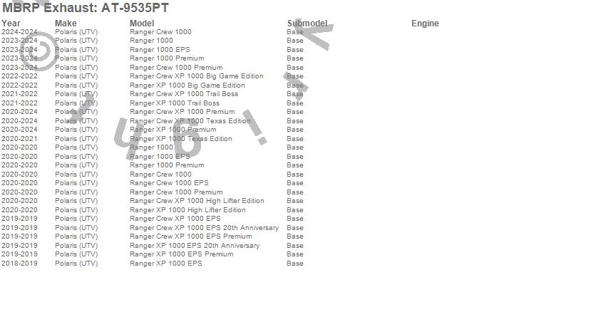 Ranger 1000, Ranger 1000 EPS, Ranger 1000 Premium, Ranger Crew 1000, Ranger Crew 1000 EPS, Ranger Crew 1000 Premium, Ranger Crew XP 1000 Big Game Edition, Ranger Crew XP 1000 EPS, Ranger Crew XP 1000 EPS 20th Anniversary, Ranger Crew XP 1000 EPS Premium, Ranger Crew XP 1000 High Lifter Edition, Ranger Crew XP 1000 Premium, Ranger Crew XP 1000 Texas Edition, Ranger Crew XP 1000 Trail Boss, Ranger XP 1000 Big Game Edition, Ranger XP 1000 EPS, Ranger XP 1000 EPS 20th Anniversary, Ranger XP 1000 EPS Premium, Ranger XP 1000 High Lifter Edition, Ranger XP 1000 Premium