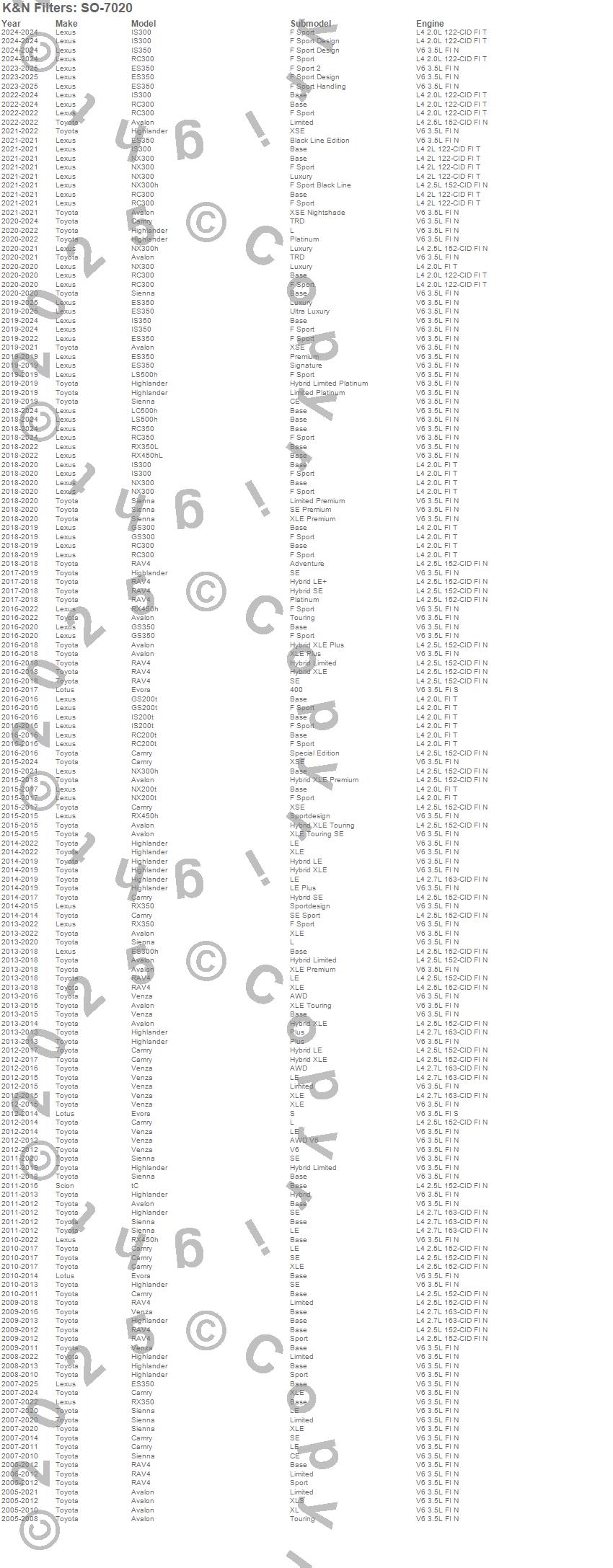 Avalon, Camry, ES300h, ES350, Evora, GS200t, GS300, GS350, Highlander, IS200t, IS300, IS350, LC500h, LS500h, NX200t, NX300, NX300h, RAV4, RC200t, RC300