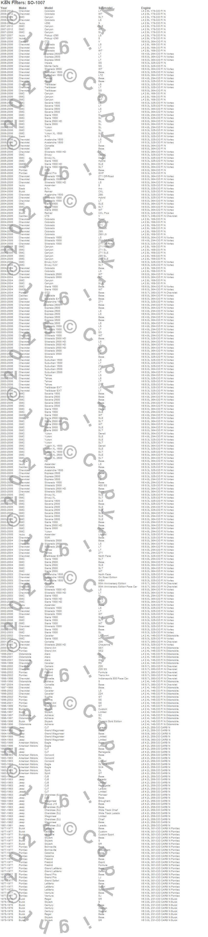 9-7X, Achieva, Alero, Ascender, Avalanche 1500, Bonneville, Camaro, Canyon, Catalina, Cavalier, Century, Cherokee (SJ), CJ5, CJ7, Colorado, Concord, Corvette, CTS, DJ5, Eagle