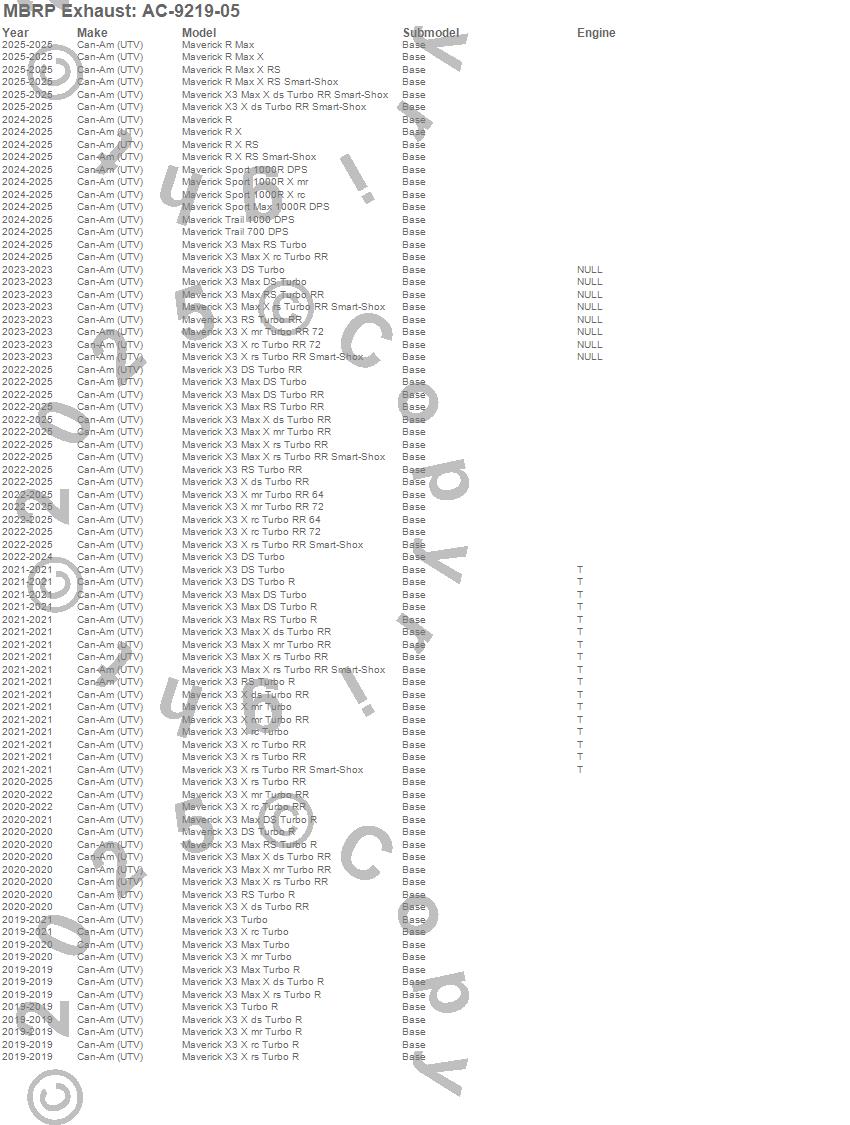Maverick R, Maverick R Max, Maverick R Max X, Maverick R Max X RS, Maverick R Max X RS Smart-Shox, Maverick R X, Maverick R X RS, Maverick R X RS Smart-Shox, Maverick Sport 1000R DPS, Maverick Sport 1000R X mr, Maverick Sport 1000R X rc, Maverick Sport Max 1000R DPS, Maverick Trail 1000 DPS, Maverick Trail 700 DPS, Maverick X3 DS Turbo, Maverick X3 DS Turbo R, Maverick X3 DS Turbo RR, Maverick X3 Max DS Turbo, Maverick X3 Max DS Turbo R, Maverick X3 Max DS Turbo RR