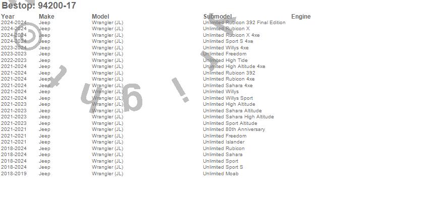 Below is an abbreviated list of applications for the Bestop SUV Top.