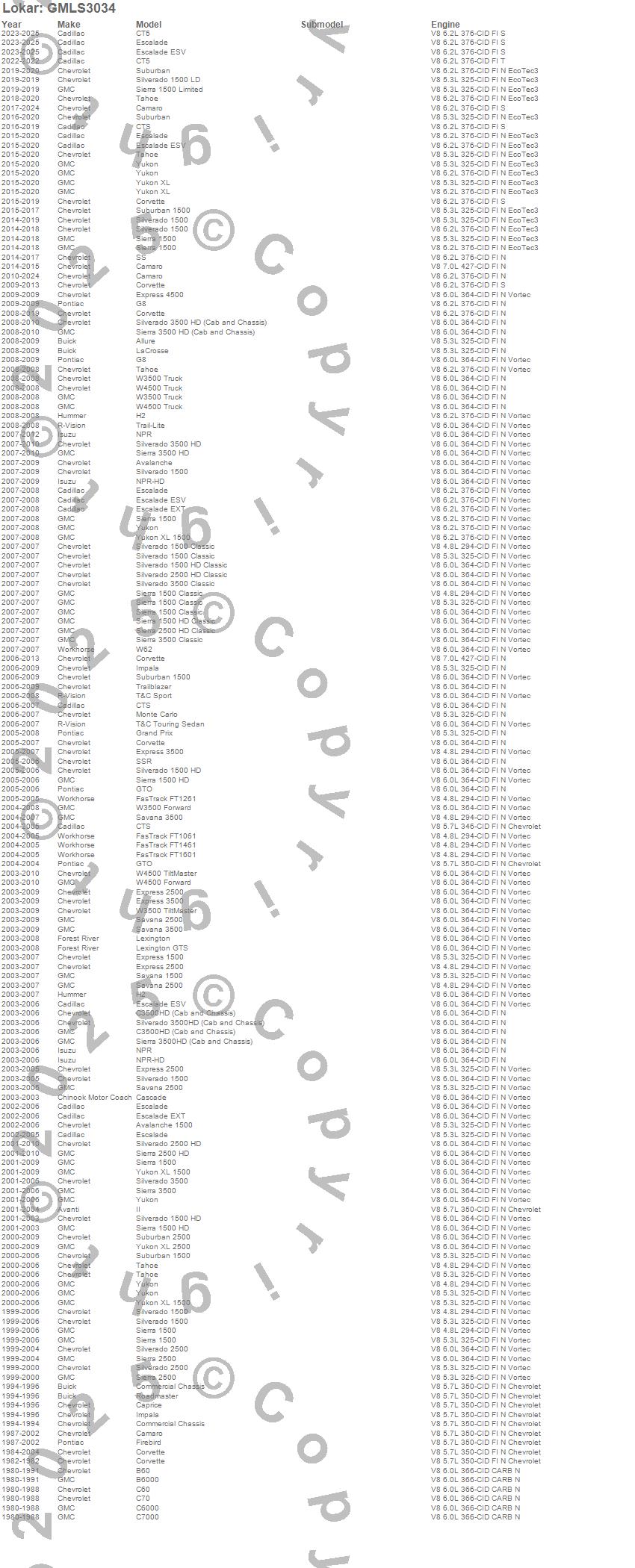 Allure, Avalanche, Avalanche 1500, B60, B6000, C3500HD, C60, C6000, C70, C7000, Camaro, Caprice, Cascade, Commercial Chassis, Corvette, CT5, CTS, Escalade, Escalade ESV, Escalade EXT