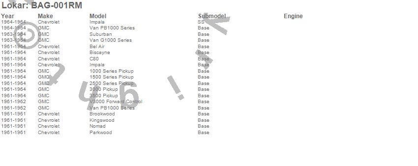 1000 Series Pickup, 1500 Series Pickup, 2500 Series Pickup, 3000 Pickup, 3500 Pickup, Bel Air, Biscayne, Brookwood, C80, G1000 Series, G1000 Series Van, Impala, Kingswood, Nomad, Parkwood, PB1000 Series Van, Suburban, V3000 Forward Control, Chevrolet, GMC