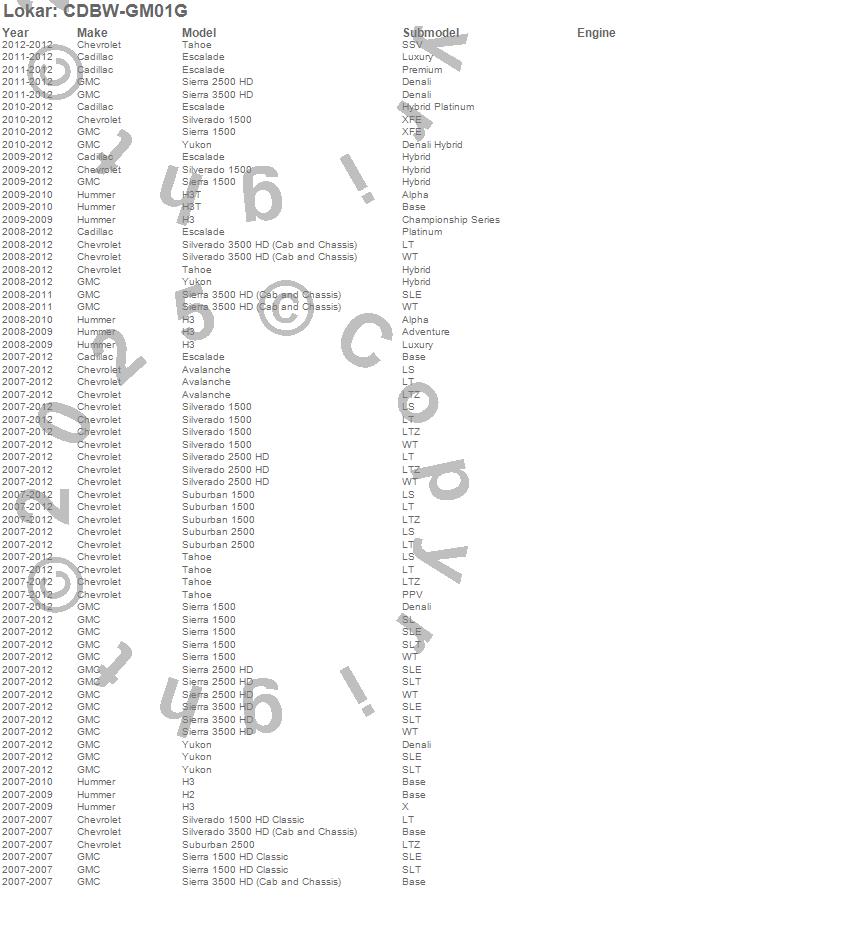 Avalanche, Escalade, H2, H3, H3T, Sierra 1500, Sierra 1500 HD Classic, Sierra 2500 HD, Sierra 3500 HD, Silverado 1500, Silverado 1500 HD Classic, Silverado 2500 HD, Silverado 3500, Silverado 3500 HD, Suburban 1500, Suburban 2500, Tahoe, Yukon, Cadillac, Chevrolet