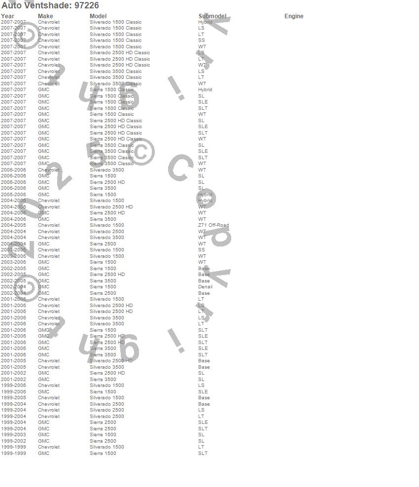 Below is an abbreviated list of applications for the Aeroshade Side Window Cover.