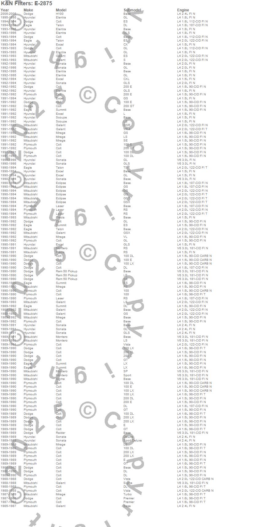 Colt, Eclipse, Elantra, Excel, Galant, H100, Laser, Mirage, Montero, Precis, Raider, Ram 50 Pickup, Scoupe, Sigma, Sonata, Summit, Talon, Dodge, Eagle, Hyundai