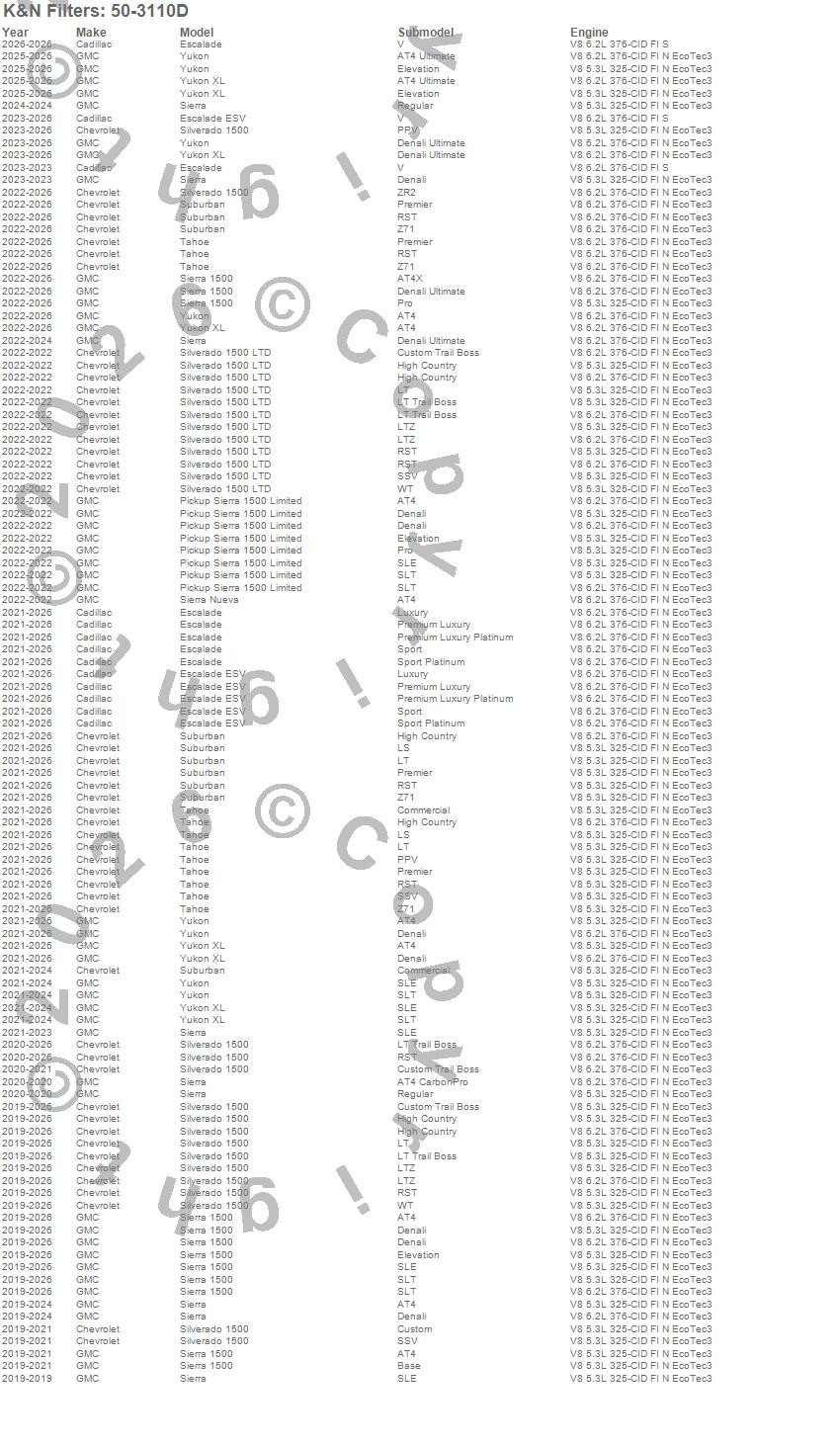 Below is an abbreviated list of applications for the Performance Air Intake System.