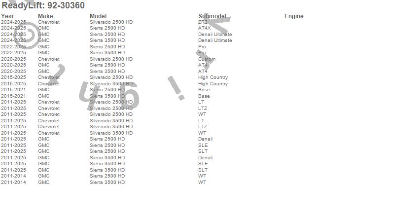 ReadyLift - Lift Kit w/Shocks P/N 92-30360 Features: