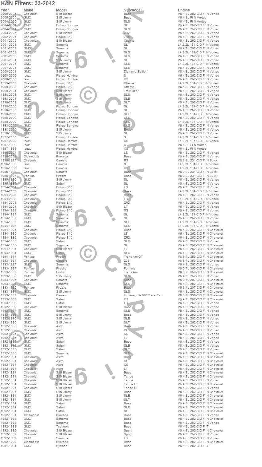 Astro, Bravada, Camaro, Firebird, Hombre, S10 Blazer, S10 Pickup, S15 Jimmy, Safari, Sonoma, Syclone, Typhoon, Chevrolet, GMC, Isuzu, Oldsmobile, Pontiac, 2005, 2004, 2003