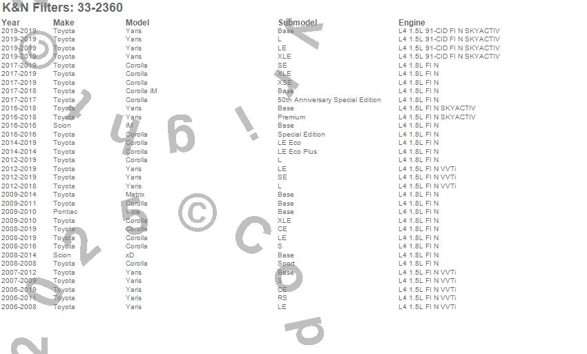 Corolla, Corolla iM, iM, Matrix, Vibe, xD, Yaris, Pontiac, Scion, Toyota, 2019, 2018, 2017, 2016, 2015, 2014, 2013, 2012, 2011, 2010