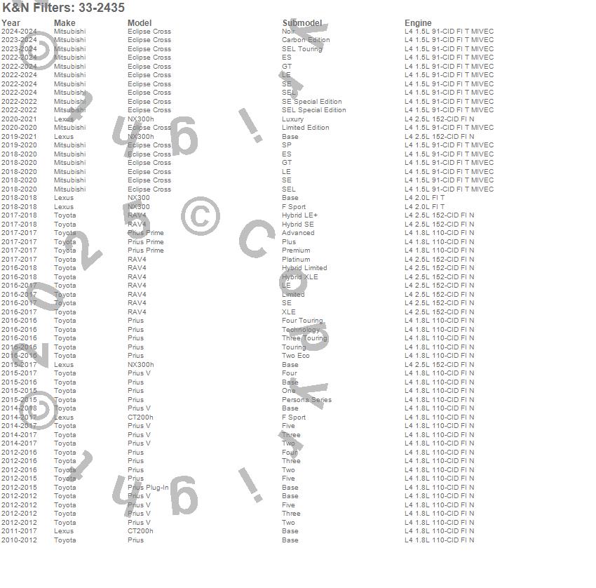 Below is an abbreviated list of applications for the Air Filter.