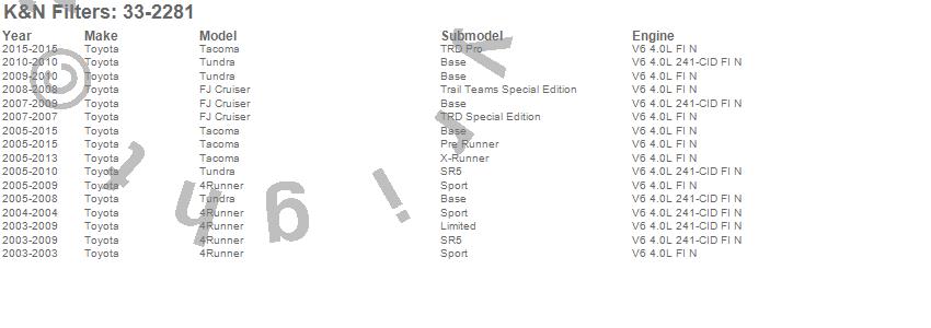 Below is an abbreviated list of applications for the Air Filter.