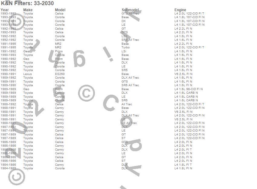 Below is an abbreviated list of applications for the Air Filter.