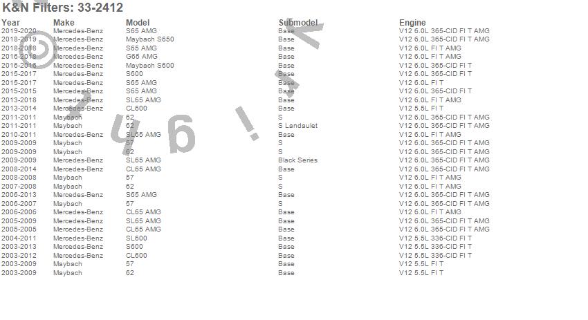 Below is an abbreviated list of applications for the Air Filter.