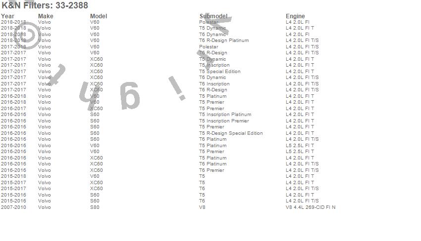 Below is an abbreviated list of applications for the Air Filter.