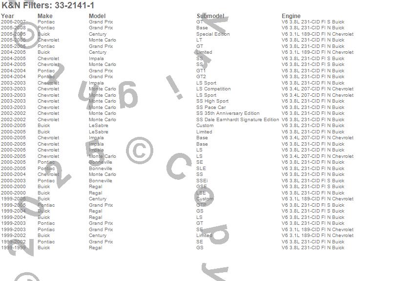 Below is an abbreviated list of applications for the Air Filter.