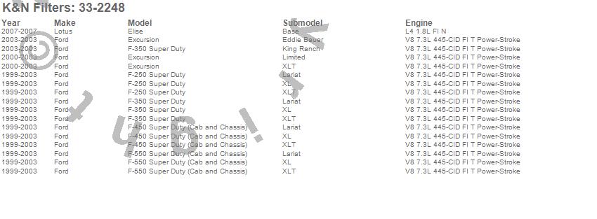 Below is an abbreviated list of applications for the Air Filter.